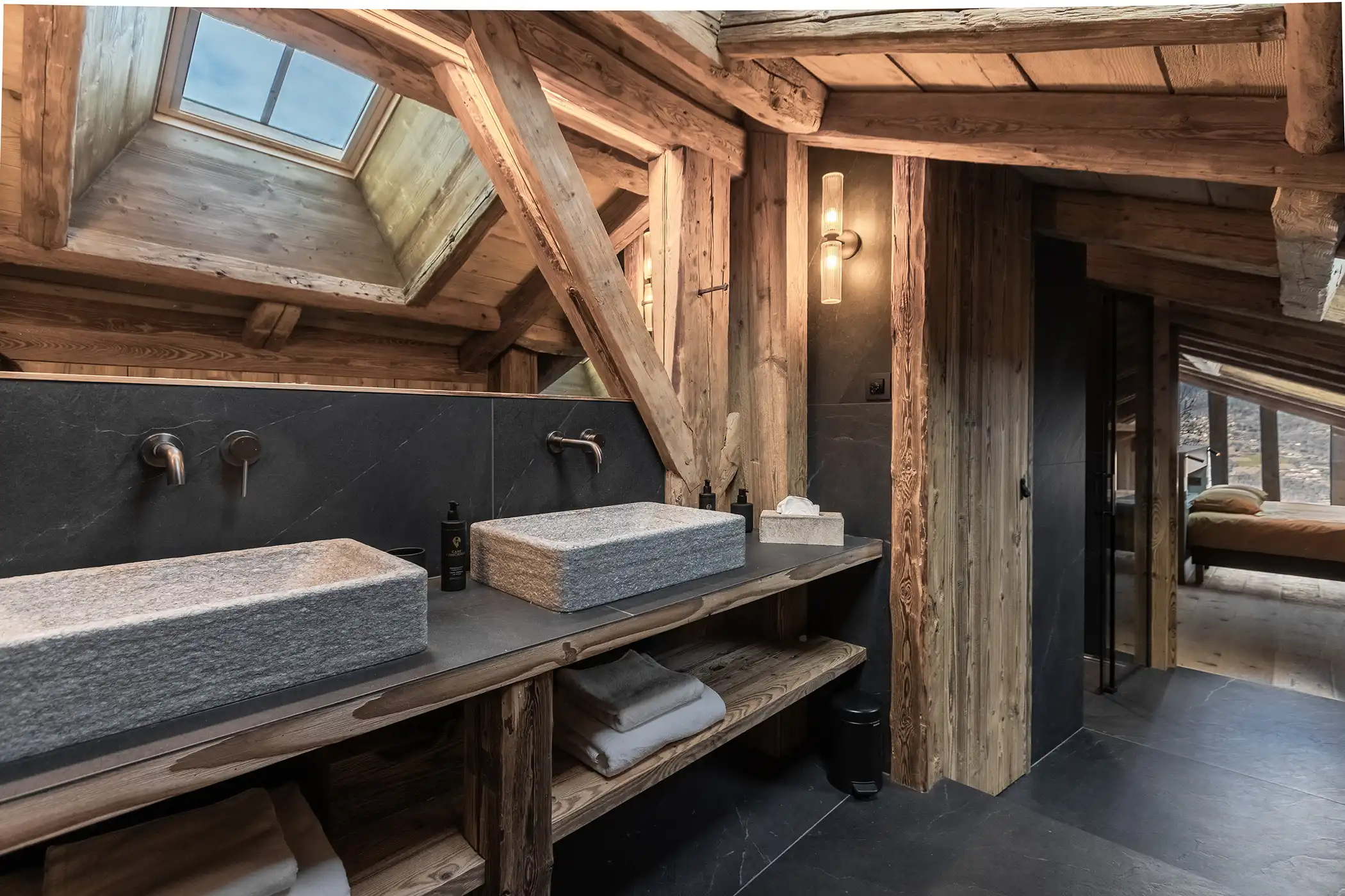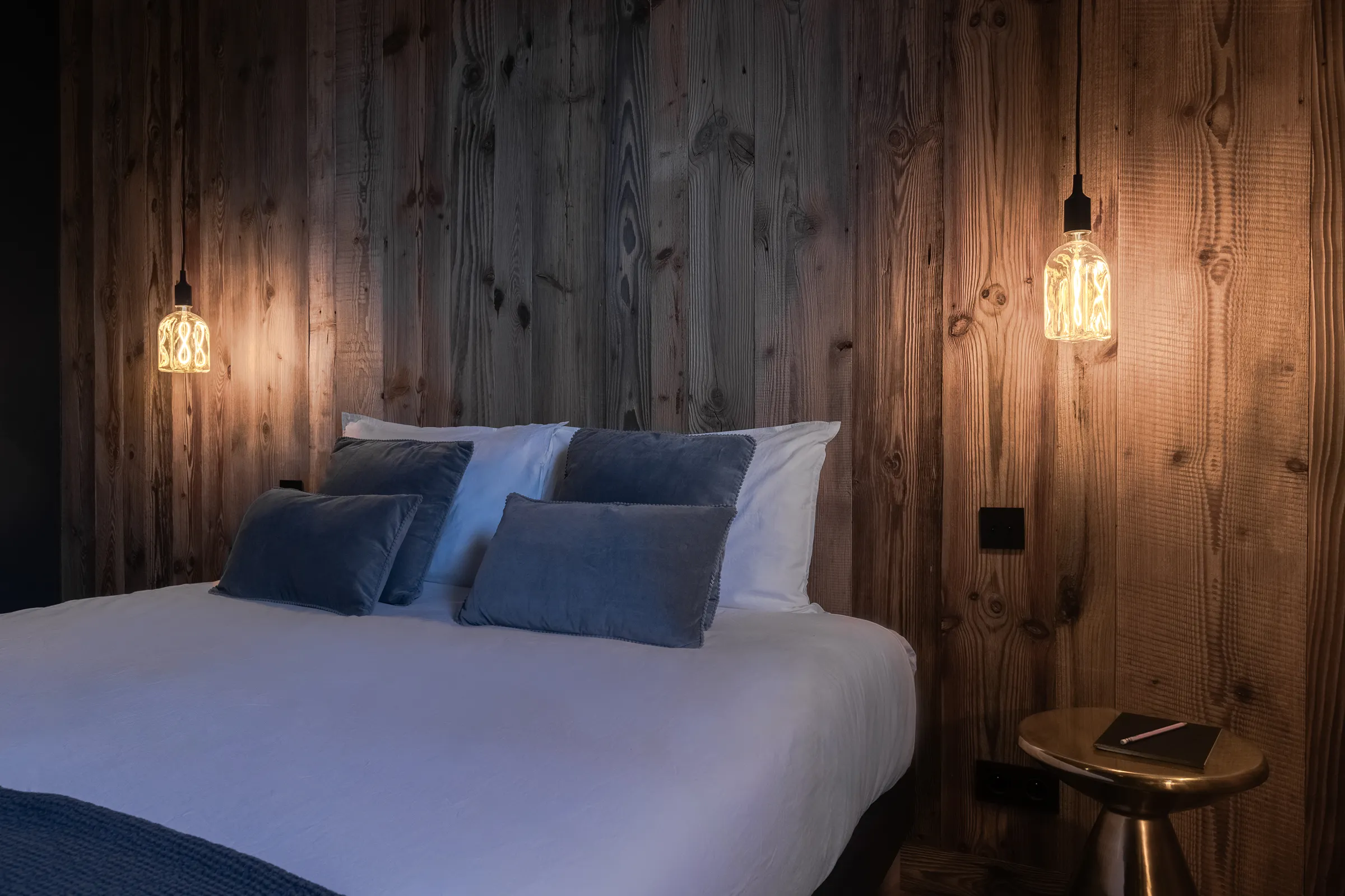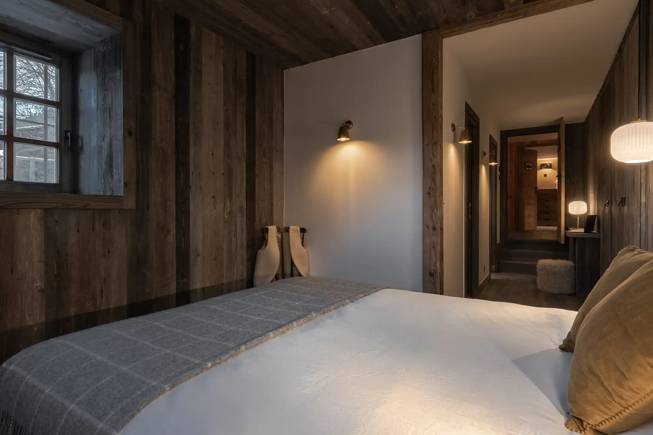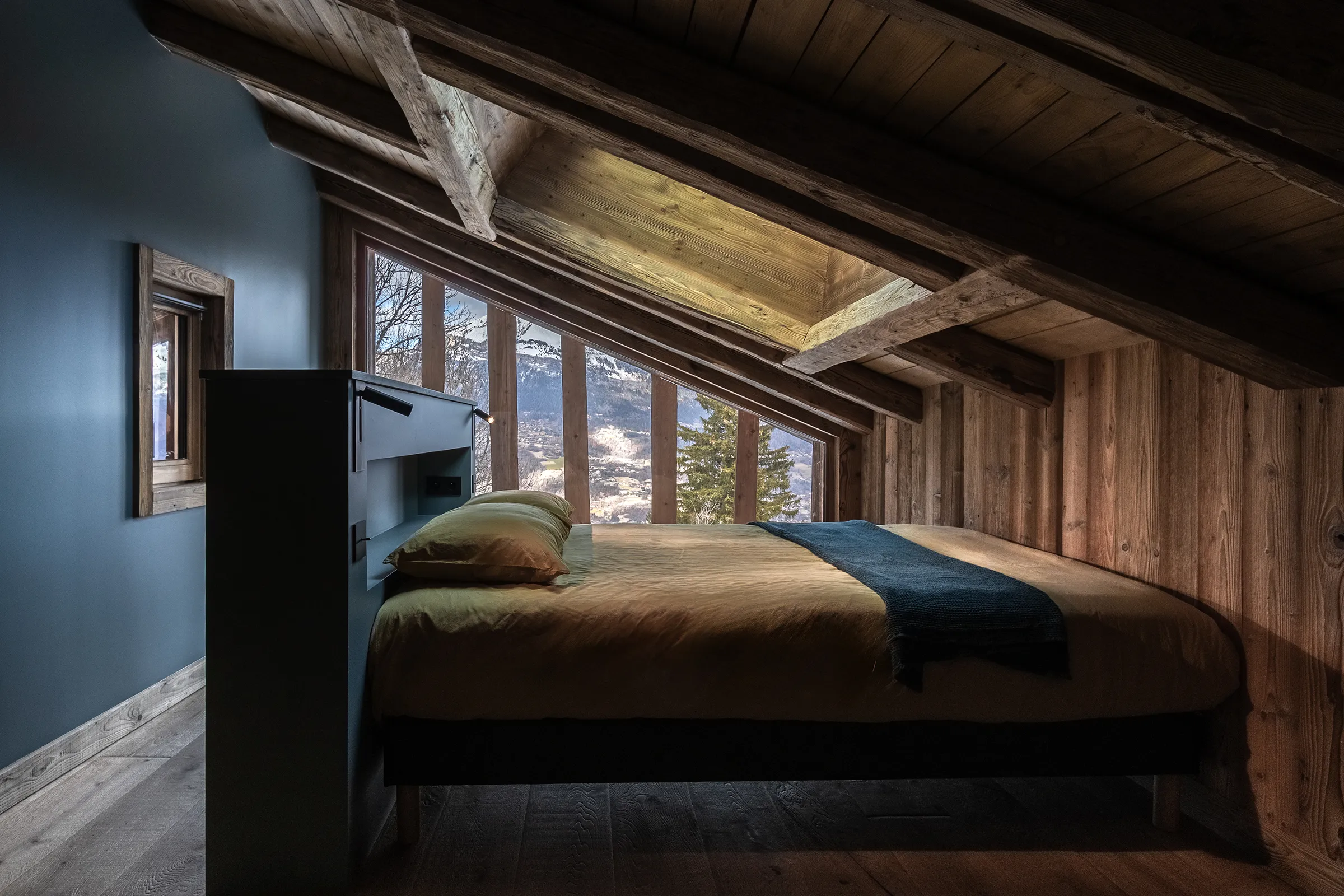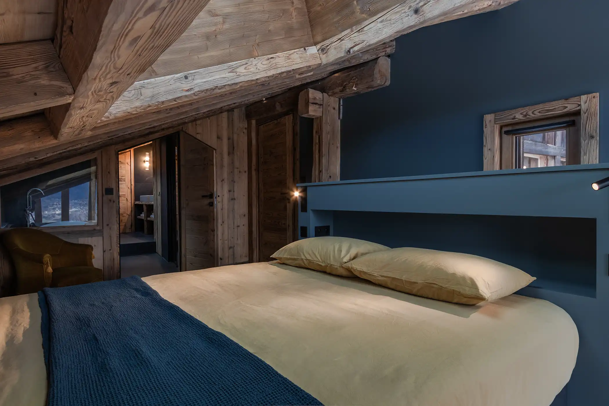 Quoi de mieux que d’être réveillé par le soleil illuminant le Mont Blanc, blotti dans un lit douillet ? Toute bardée de vieux bois, cette suite combine une authentique ambiance de refuge et le confort moderne.